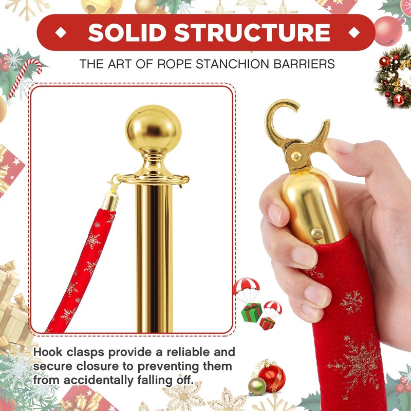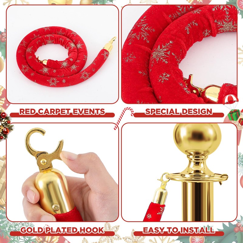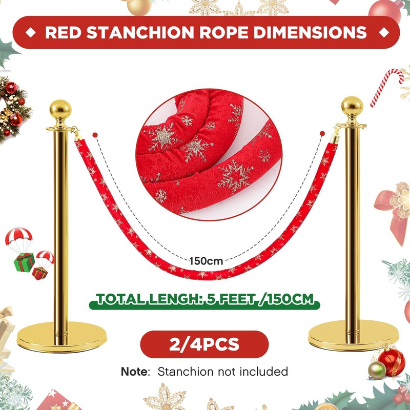 • Package Included: You will receive 4 red velvet stanchion rope with gold hooks, each christmas red stanchion rope is about 5 feet (60 inches) long and 1.2 inches in diameter; The christmas velvet stanchion rope come with a classic snowflake pattern design to meet most of your xmas event decoration needs, please note that the pillars are not included in the package