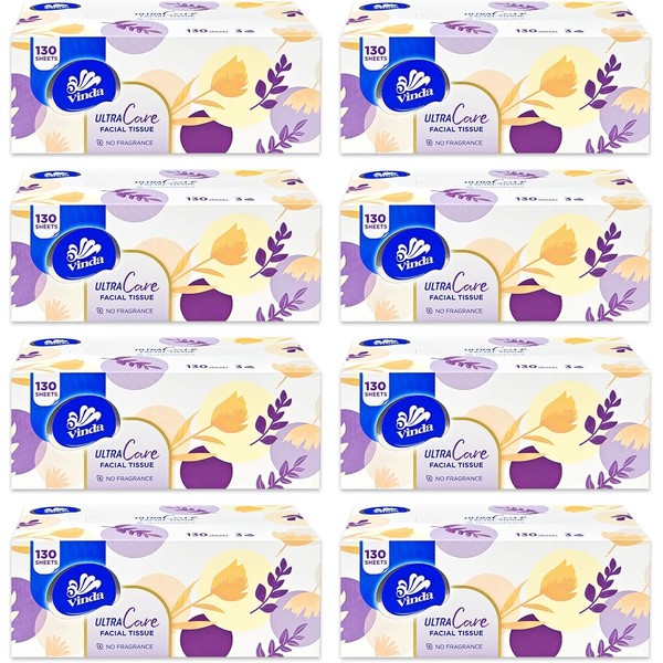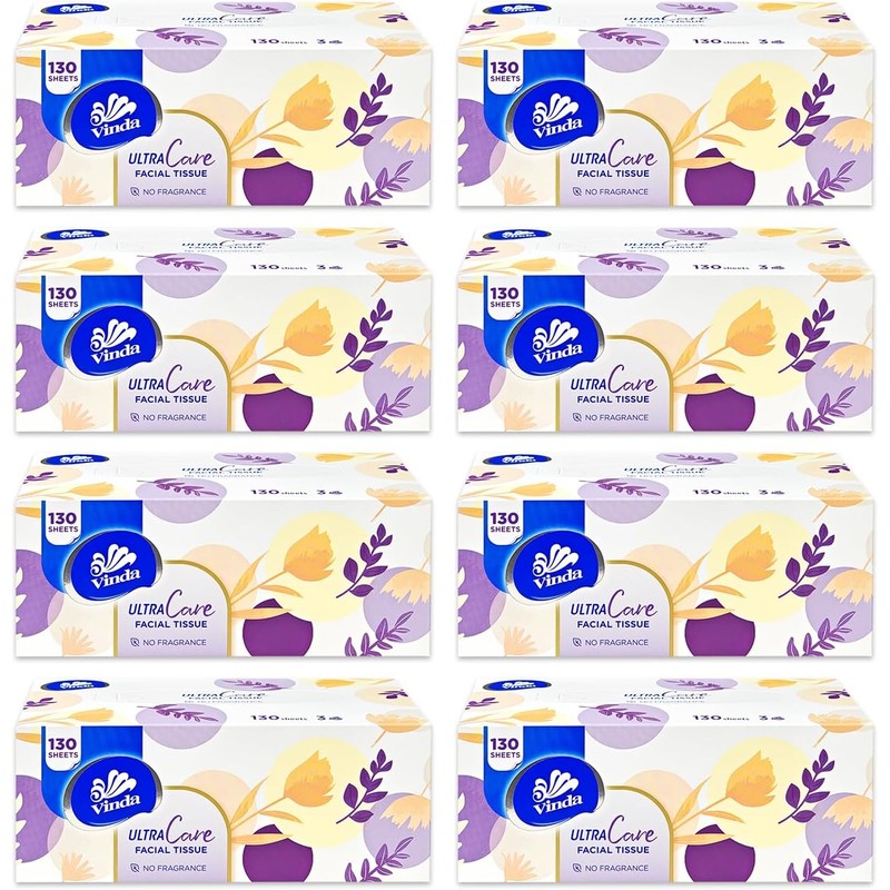 Vinda - Premium Soft 3-Ply Ultra Care Facial Tissues, 130 Count Each Box (8 Flat Boxes), Strong & Gentle for Sensitive Skin, Perfect for Home & Office