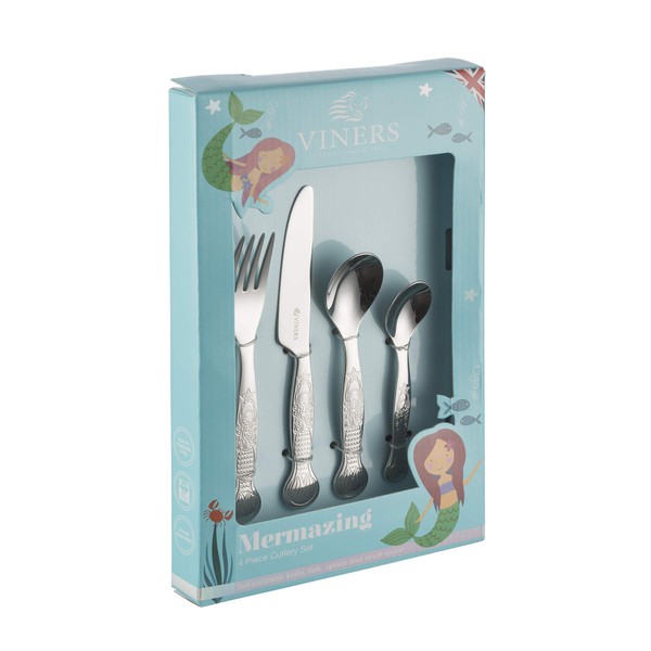 - 4 PIECE SET | This Viners cutlery set is perfect for children as they grow and learn to eat independently. The set includes one table knife, one table fork, one dessert spoon and one tea spoon, packaged in an underwater mermaid-themed gift box
