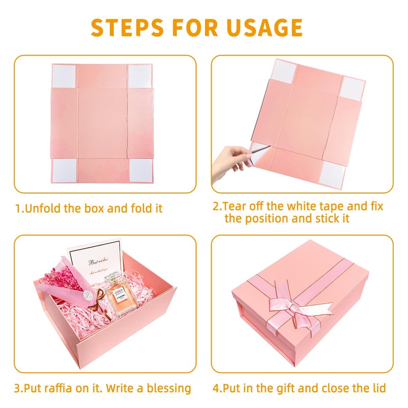 - 【Meticulous Workmanship】Our collapsible boxes for gifts has fine workmanship, delicate and smooth surface with texture, beautifully handled around the edges of the product, and strong adhesive force. This gift box with lid can be placed flat when not in use, saving you space and reducing trouble.