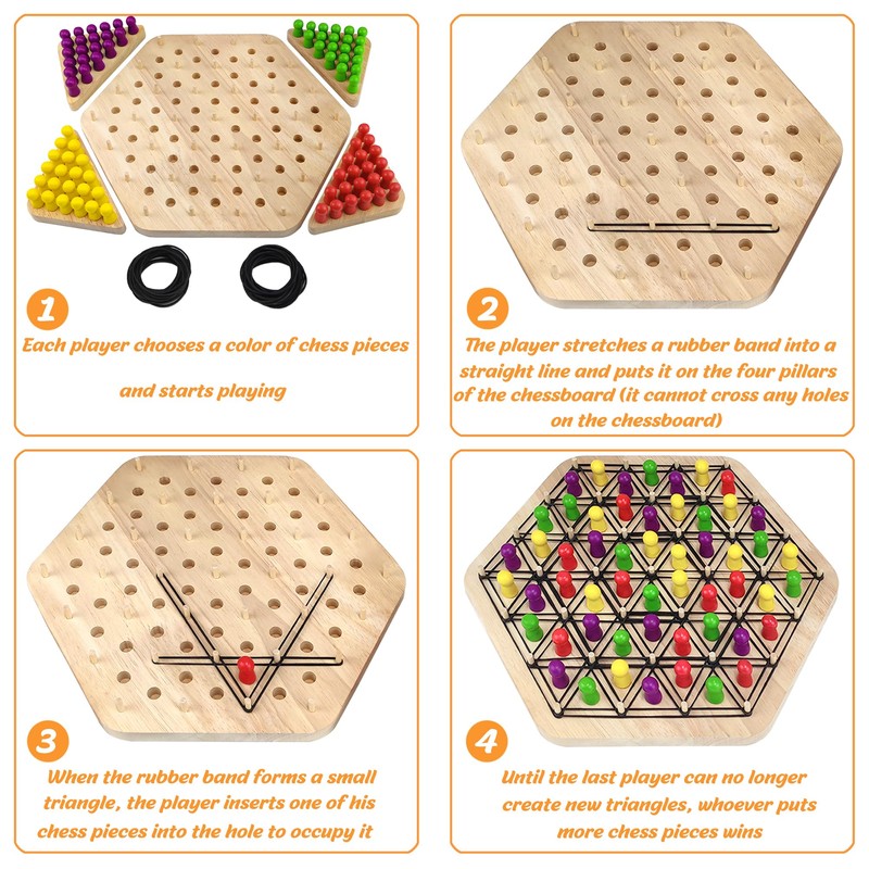 - [Larger design]: More meaningful and larger chess board, rubber bands and color tiles; The chain triangle game is a fun strategy board game that is perfect for family gatherings, parties or casual game nights at home. 2 to 4 players, ages 3 and up, fun for all ages; Larger board sets can give you more fun and better gaming experience