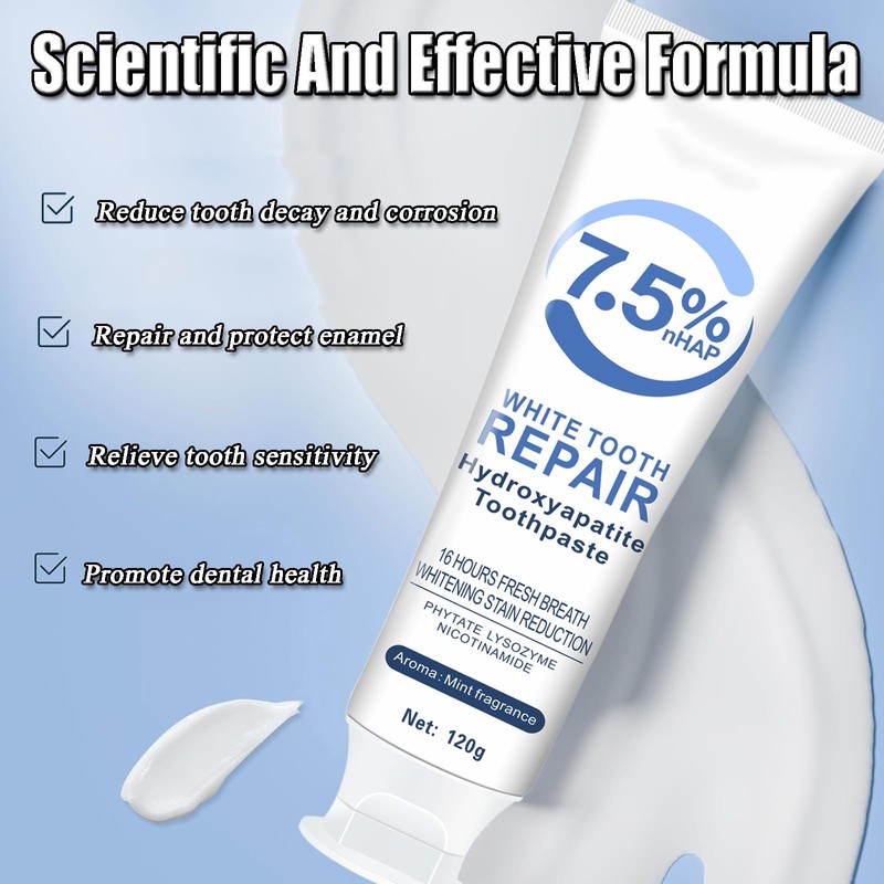 Specifications:Name: Hydroxyapatite toothpasteShelf life: 3 yearsNet content: 120g/4.1 ouncesEfficacy: fresh breath, keep the mouth moist, fresh and fragrant.Package includes: 2 pieces of hydroxyapatite toothpasteNote:1. Due to manual measurement, please allow 1-5g/1-2cm difference.2. Due to different monitors and lights, the picture may not reflect the actual color of the item. Thank you for your understanding.How to use toothpaste: Take an appropriate amount of toothpaste and squeeze it on the toothbrush. Brush your teeth for at least three minutes in the morning and evening. Rinse your mouth in time after brushing your teeth.