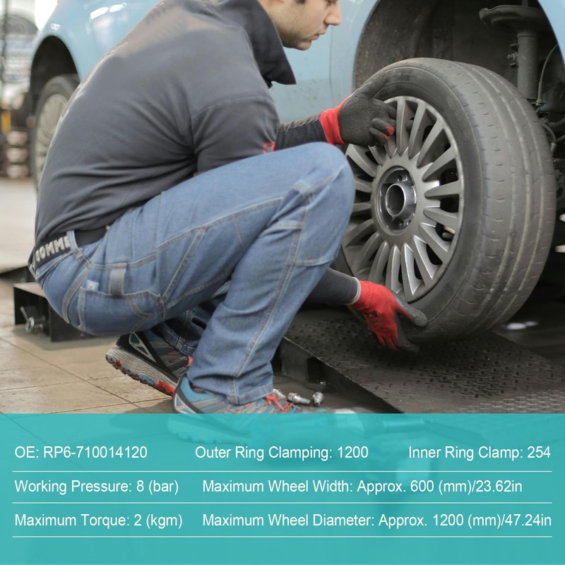 - 【Reference data】Duck head tire changer maximum wheel width is about 600 (mm)/23.62in. Maximum wheel diameter is about 1200 (mm)/47.24in. Maximum torque: 2 (kgm). Outer ring clamping: 1200. Inner ring clamp: 254. Working pressure: 8 (bar).