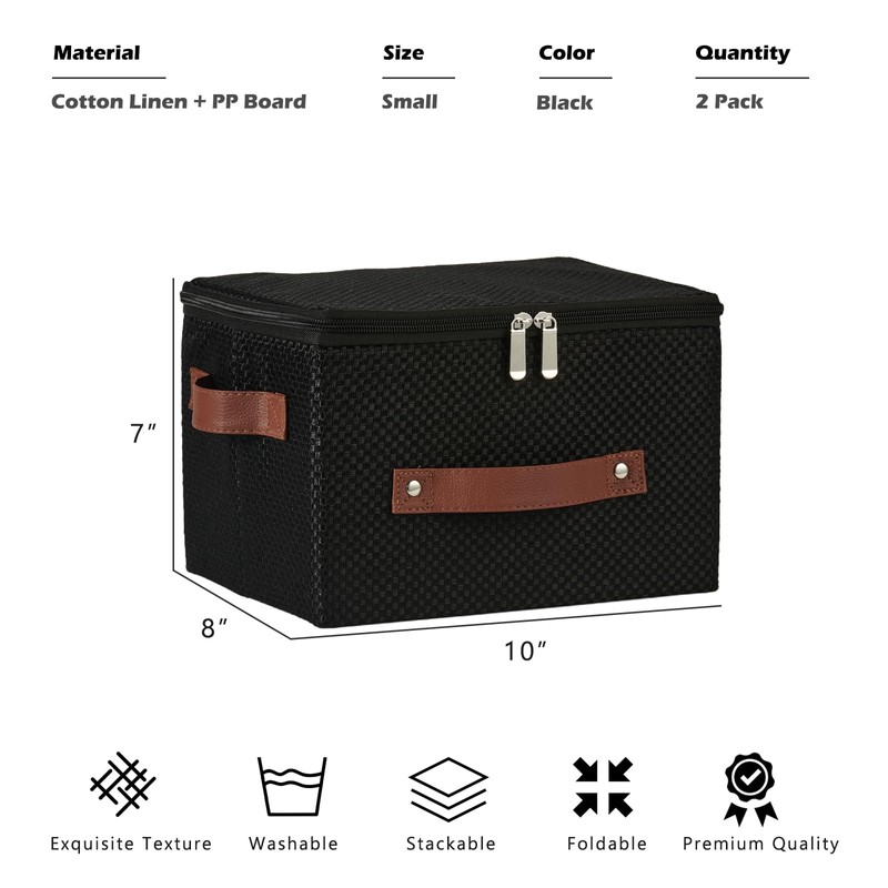 - Package Includes: 2 pack small fabric storage bins measuring 10" x 8" x 7". Color: Black. Lid Type: Zipper.