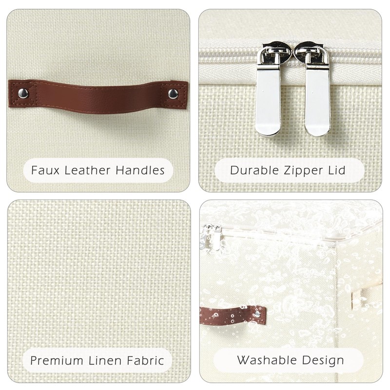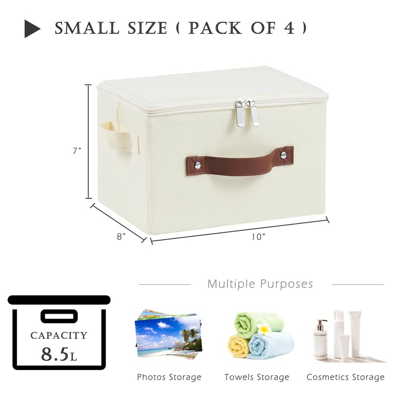 VinneGenzz 4 Pack Storage Bins with Zipper Lid Cotton Linen Fabric Lidded Storage Baskets Boxes Foldable Washable Closet Shelf Clothes Organizer Container with PU Leather Handles (Beige, Small)