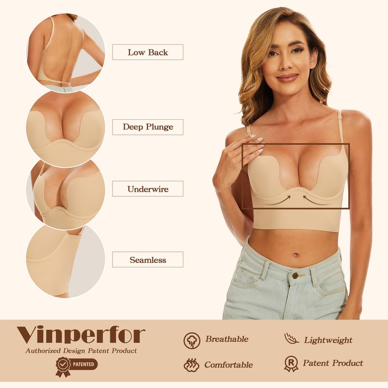 - VERSATILE DEEP U-SHAPED BACKLESS BRA-The convertible straps allow this bra to function in multiple ways: as a plunging bra, low back bra, backless bra, halter bra, criss-cross back bra, invisible bra, clear strapless bra, open back bra, low cut bra, perfect for weddings, and even for daily wear.