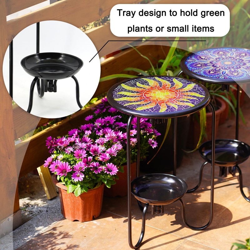 VinSees Modern Mosaic Sun Glass Patio with Bottom Tray - Outdoor Side, Small Accent for Yard, Porch, Garden, Living Room, Coffee Tea, Plant Stand (Mosaic Sun)