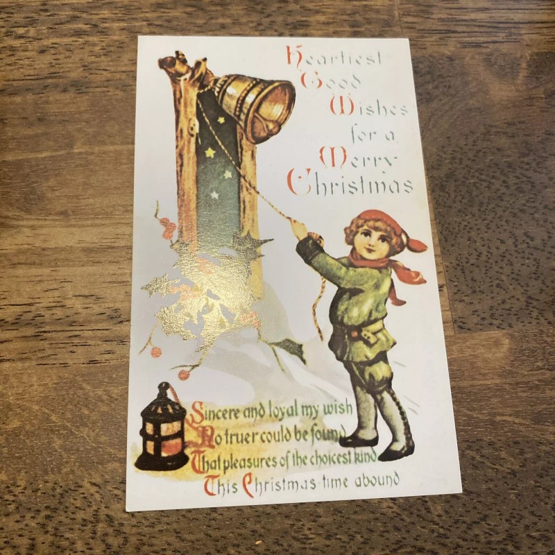 Vintage Christmas Postcard Reproduction Image Boy Ringing Bell Holly Lantern New