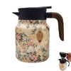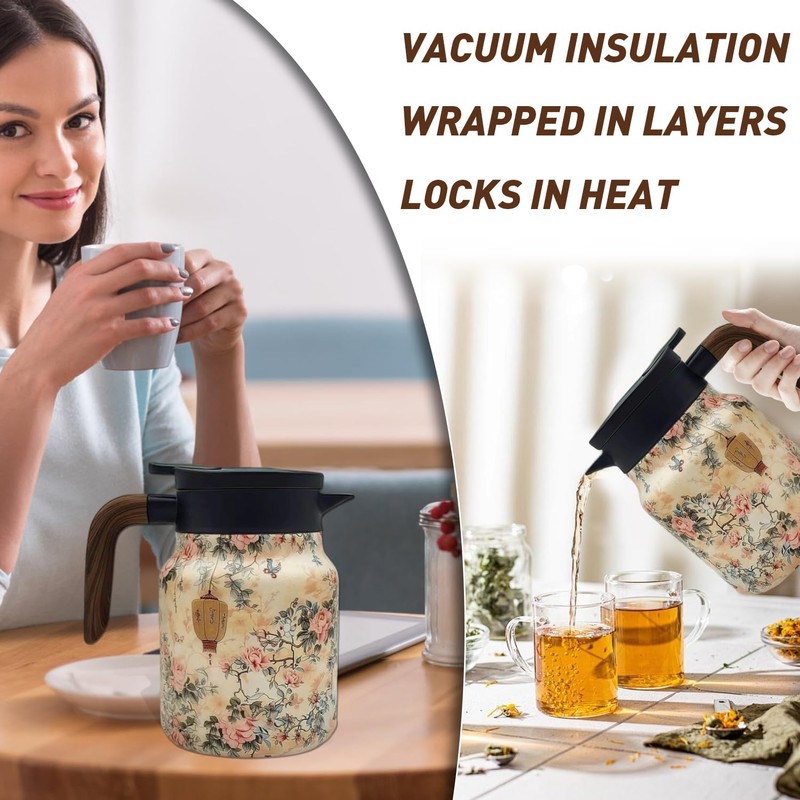 Vintage Floral Pattern Tea Thermos Built in Infuser, 1000ML Insulated Teapot with Lid and Wooden Handle, Stainless Steel Detachable Thermal Teapot for Hot Drinks