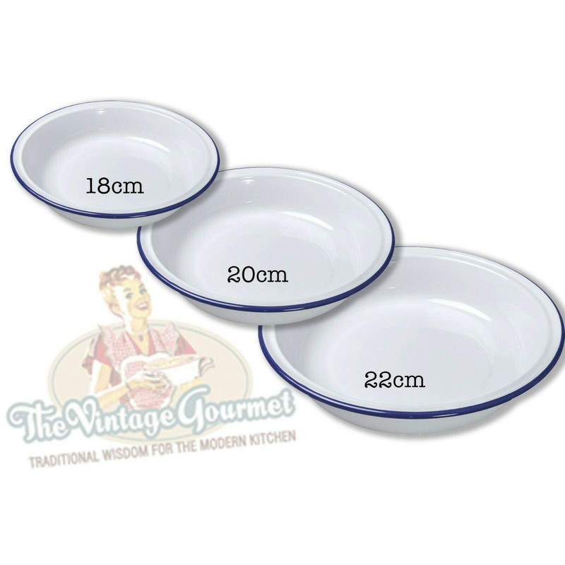 Vintage Gourmet ® Premium White Enamelware with Blue Rim, Oblong, Round Pie Dish Sets Iconic Retro Bakeware (Set of 3 Round Pie Dish 18,20,22cm)
