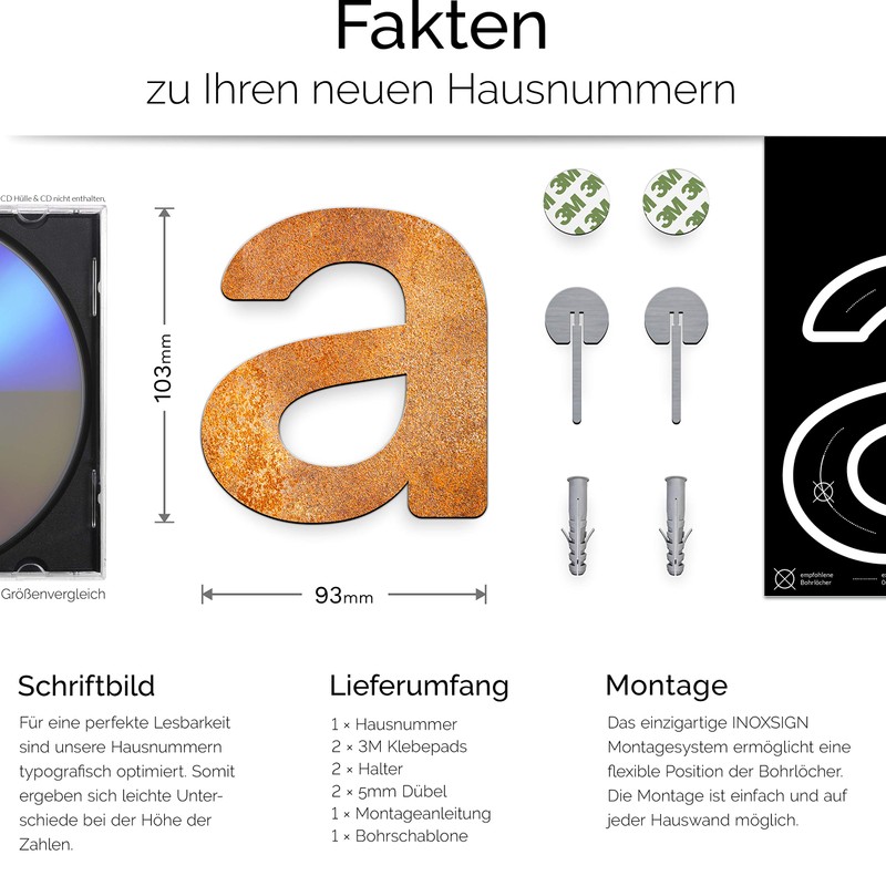 - Technical data: height: 140 mm, material thickness: 2 mm. Box contents: 1 metal house no. made of weatherproof self-protective Corten steel, 2 retaining anchors (stainless steel), 2 dowels, 2 high-strength adhesive pads, 1 instructions (English language not guaranteed), 1 drilling template, mounting tip: the drilling template as a position finder: stick on the template. and in peace the best Find the house number on the wall of the house