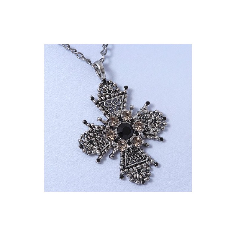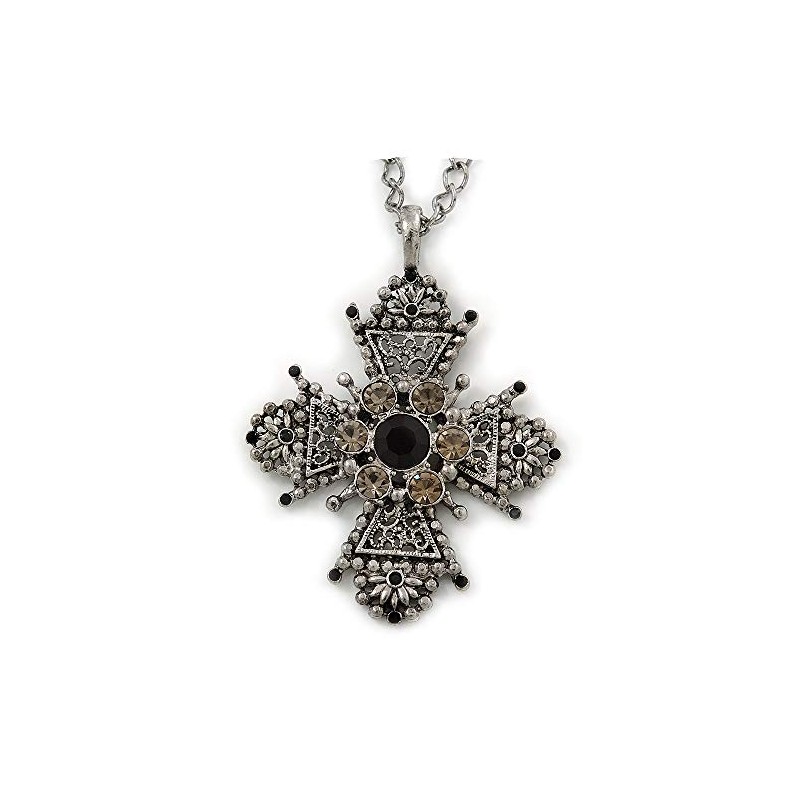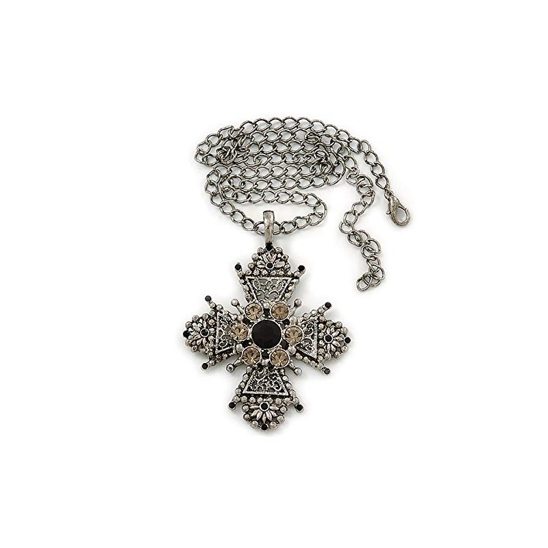 Vintage Inspired Filigree Diamante 'Cross' Pendant with Silver Tone Oval Link Chain - 40cm Length/ 6cm Extender