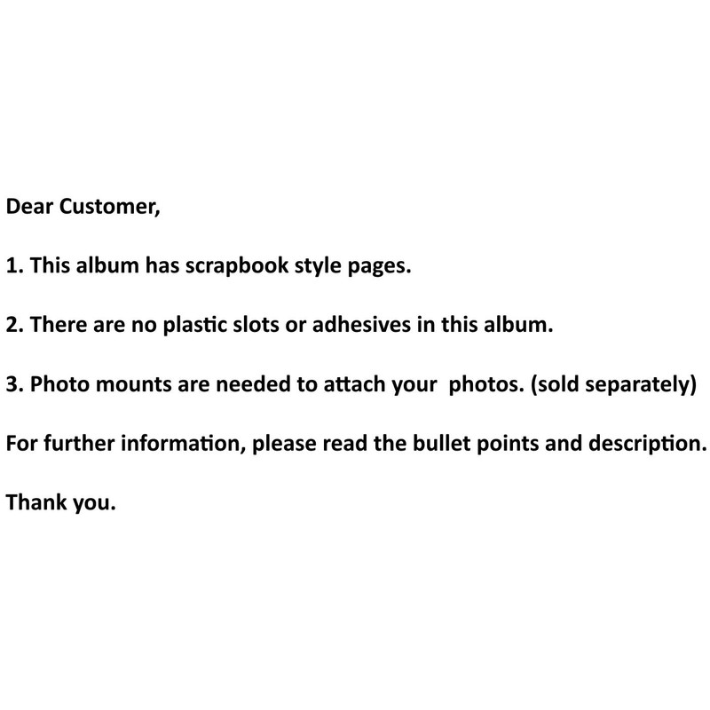 - **Photo mounts required.** Traditional cardstock pages with semi-transparent sheet between each page. Includes 100 pages (50 sheets) of cardstock pages.