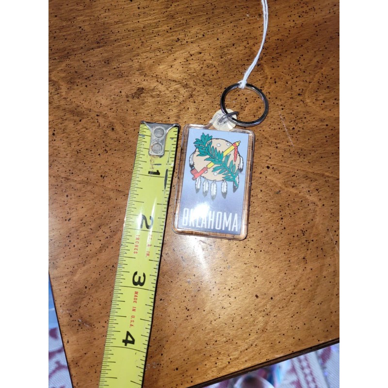 Discover this vintage Oklahoma State keychain, a perfect addition to your collection. Crafted from durable acrylic, this double-sided keychain is a unique piece that showcases your love for the state. Its compact size of 2" x 1.25" makes it easy to carry around and show off to your friends.