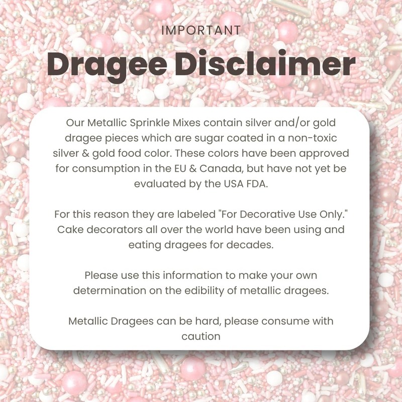 - Our metallic sprinkle mixes contain silver and/or gold dragees. Metallic dragees can be hard, please consume with caution