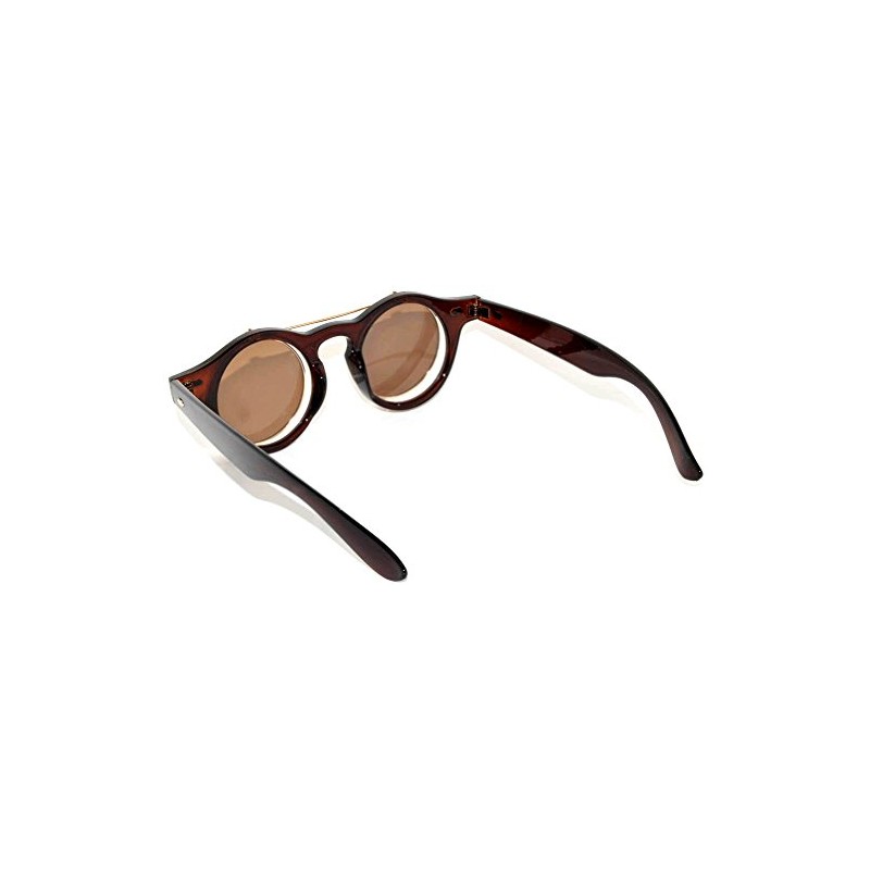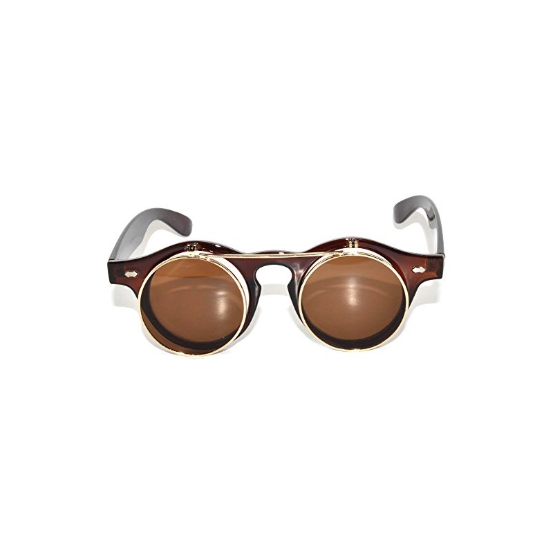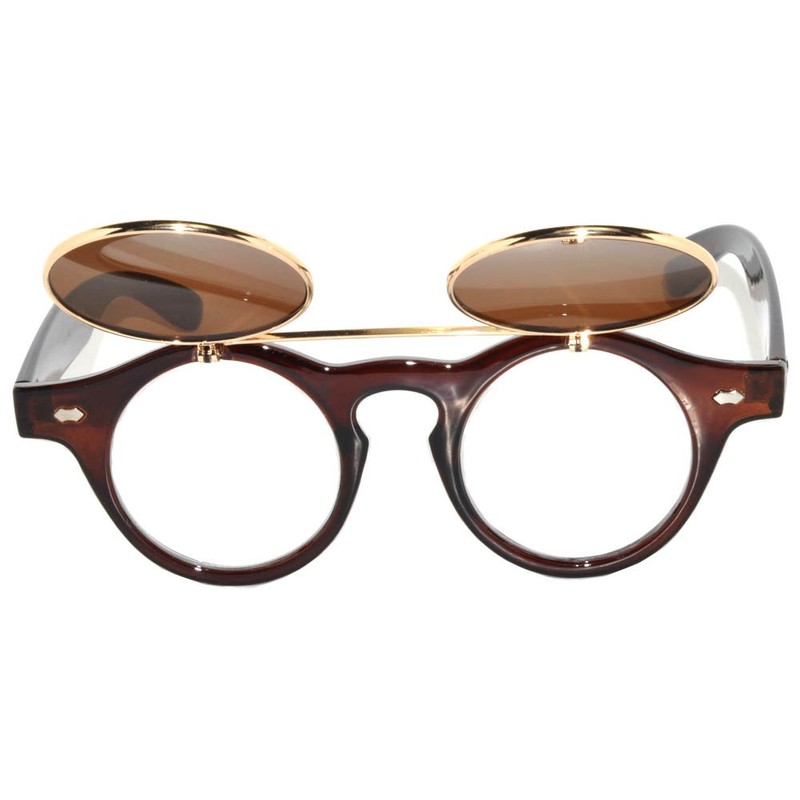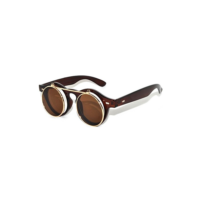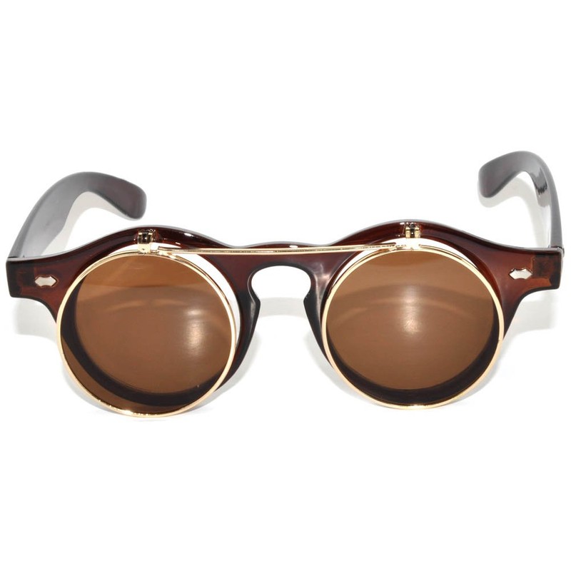 Vintage Steampunk Circle Flip Up Sunglasses Brown Gold Frame Brown Lens