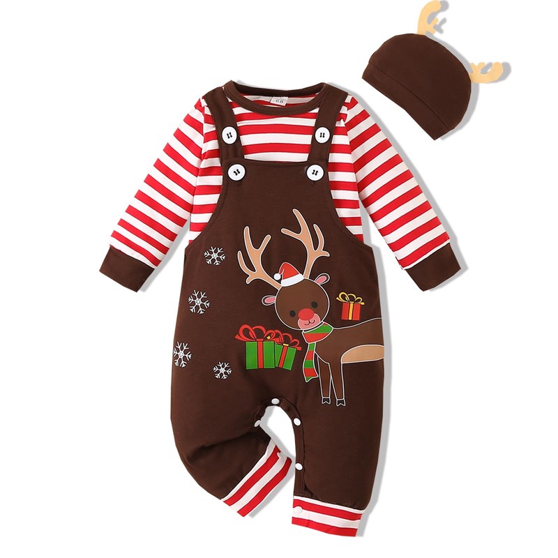 - Design: Cotton overalls pant+long sleeve stripe T-Shirt+ buckhorn hat,3pcs outfits set for baby boys,Reindeer pattern overall pants are suitable for Christmas,Snap closure,easy for putting on and taking off,also easy for changing diaper.Classic stripes T-shirt are very cute and fashionable,adorable hat with buckhorn.