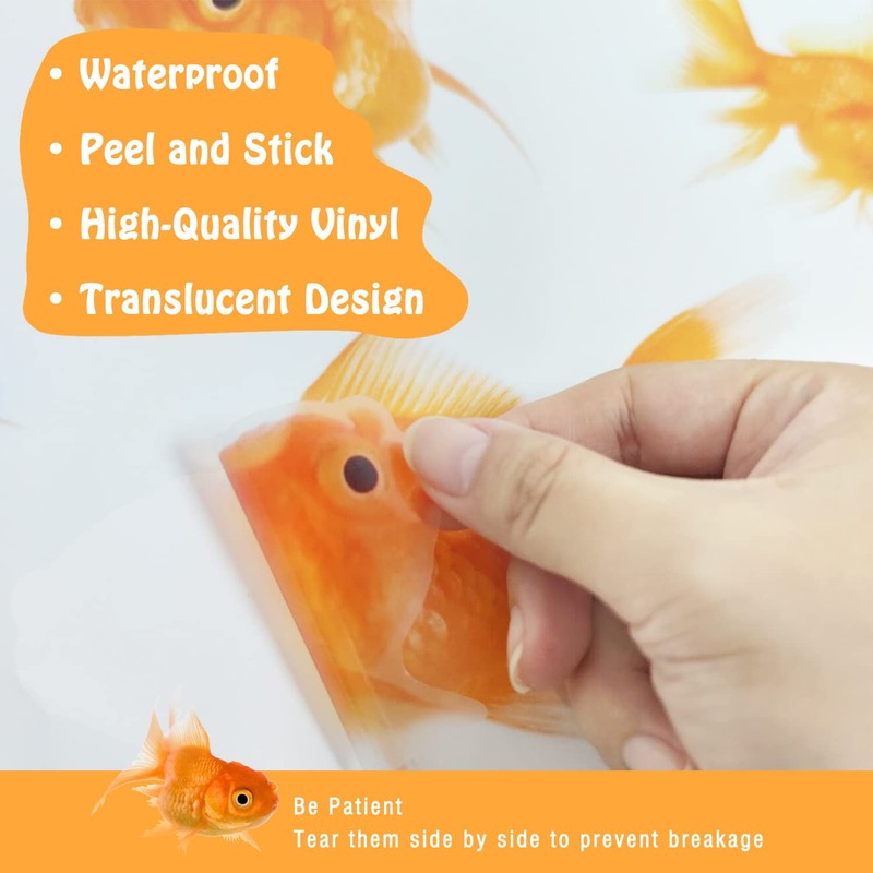 - ✿ Self-Adhesive Vivid Goldfish Sticker Decals: You will get 12 different lifelike goldfishes shot from different angles. The goldfish size is about 4~6inch. Simply peel and stick to apply. Easily removable, repositionable and reusable with no sticky residue. Can be applied to nearly any hard and smooth surface. y hard and smooth surface.