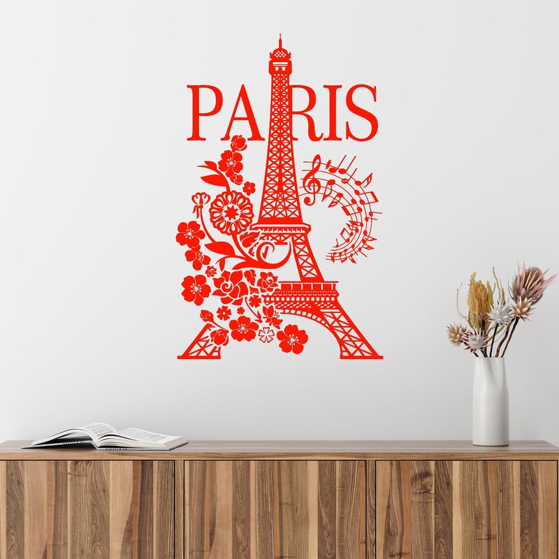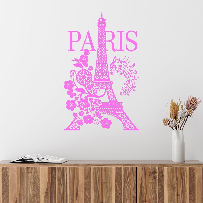 Vinyl Wall Decal Paris Eiffel Tower Romantic Musical Notes Flowers Stickers Mural Large Decor (g4977) Black