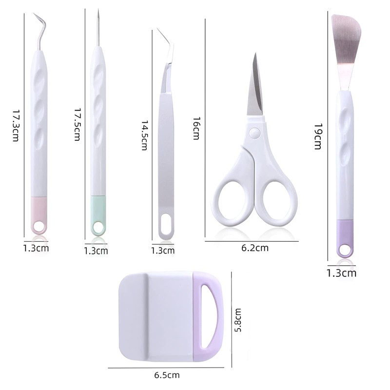 - 🎨【6 Pcs Set】1 x Hook Weeder, 1 x hook tweezer, 1 x scissor, 1 x stitching tool, 1 x scraper, 1 x spatula, total 6pcs.