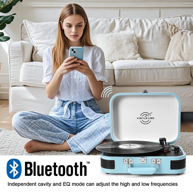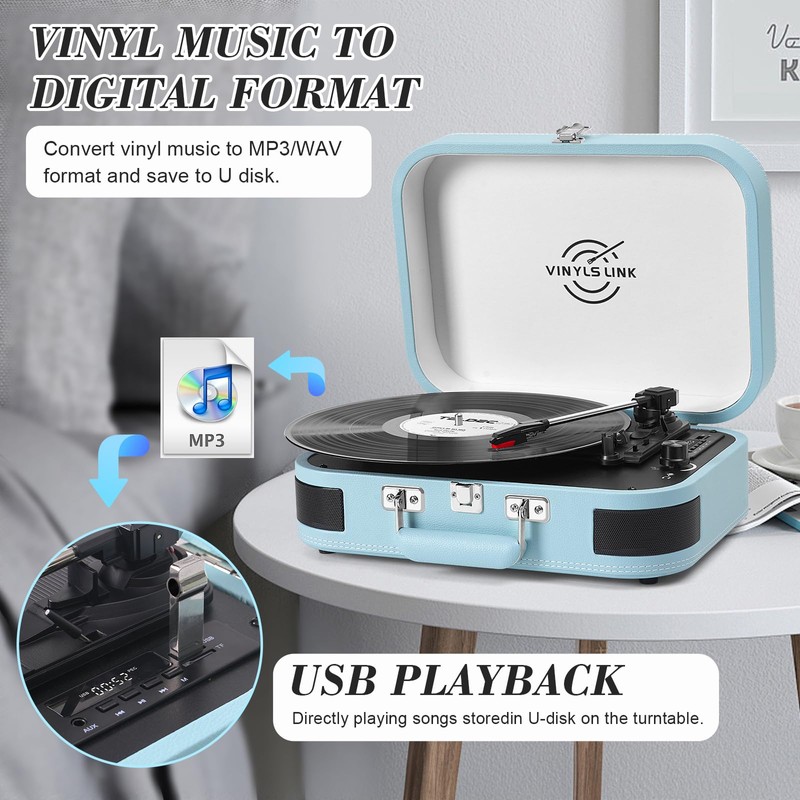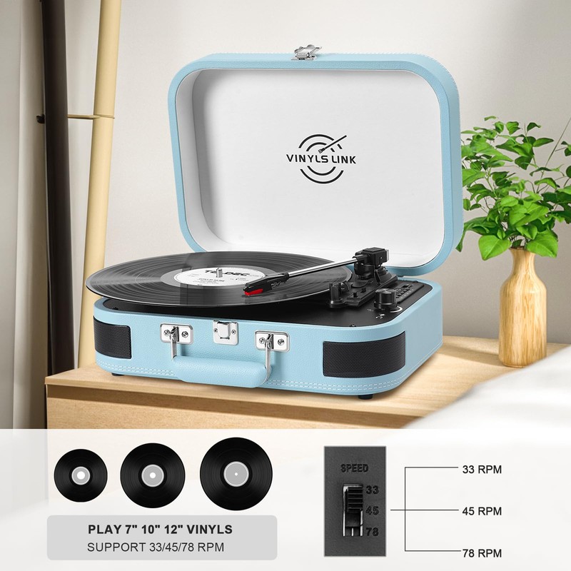 VINYLS LINK Vinyl Record Player 3 Speed Bluetooth Turntable Belt Drive LP Play Portable Suitcase Record Player Built-in Speaker with EQ Mode USB Recording RCA Output/AUX Input Headphone Jack Blue