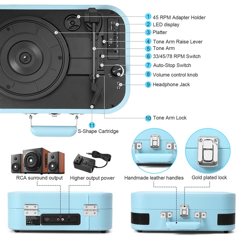 - 【Retro portable design, enjoy music anytime, anywhere】 This portable vinyl record player adopts a suitcase design, which is lightweight and portable, making it easy for you to carry it in your dormitory, home or outdoor parties. No matter where and when, you can enjoy the unique charm of vinyl music.