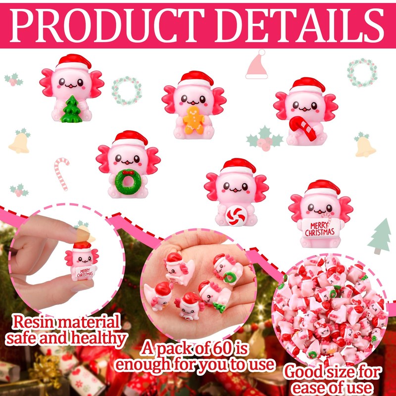 • Packaging Includes: you will get 60 pieces tiny axolotl wearing Christmas hats; These mini axolotl are holding Christmas trees, gingerbread men, doughnuts, candies, candy canes, etc, creating a strong Christmas atmosphere