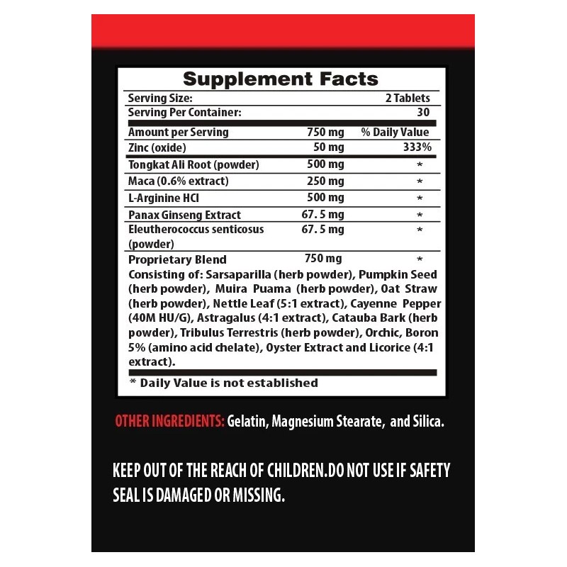 - Active Ingredients: Astragalus, Boron, L-Arginine, Maca Extract, Muira Puama, Nettle Leaf, Panax Ginseng Extract, Tribulus Terrestris