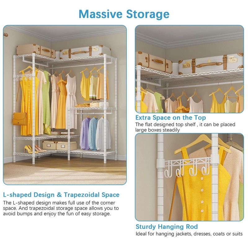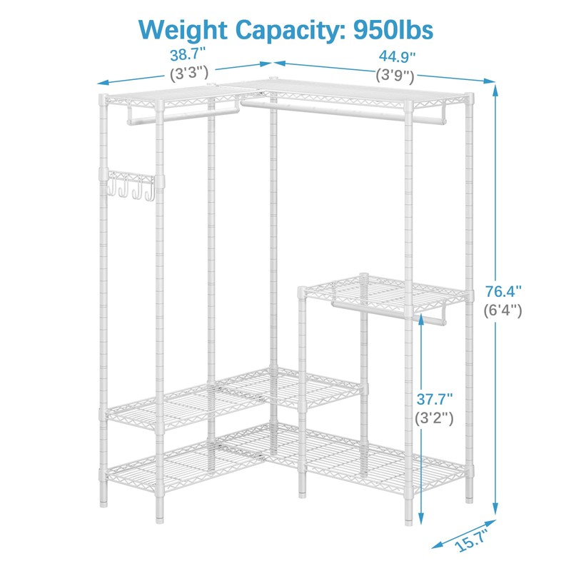 - LARGE CAPACITY SPACIOUS CLOSET : VIPEK L3 corner clothes rack offers large storage space for all your clothing and accessories. With its L-shaped design,our wardrobe reaches new heights in both visual appeal and practicality. Maximizing every inch of available room. Dimensions: 44.9"L x 38.7"W x 76.4"H, 950 lbs weight capacity.