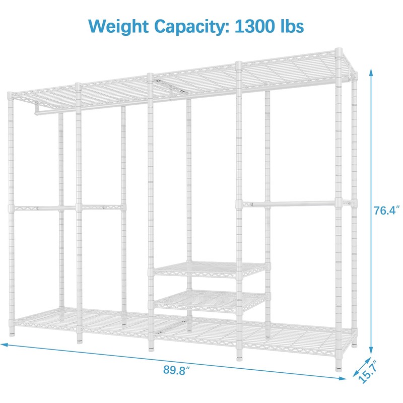 - Dimensions & Load Capacity: 89.8" L x 15.7" W x 76.4" H. Load capacity up to 1300 lbs. Single hanging rod can support up to 75 lbs, and wire shelf can support up to 88 lbs for each.