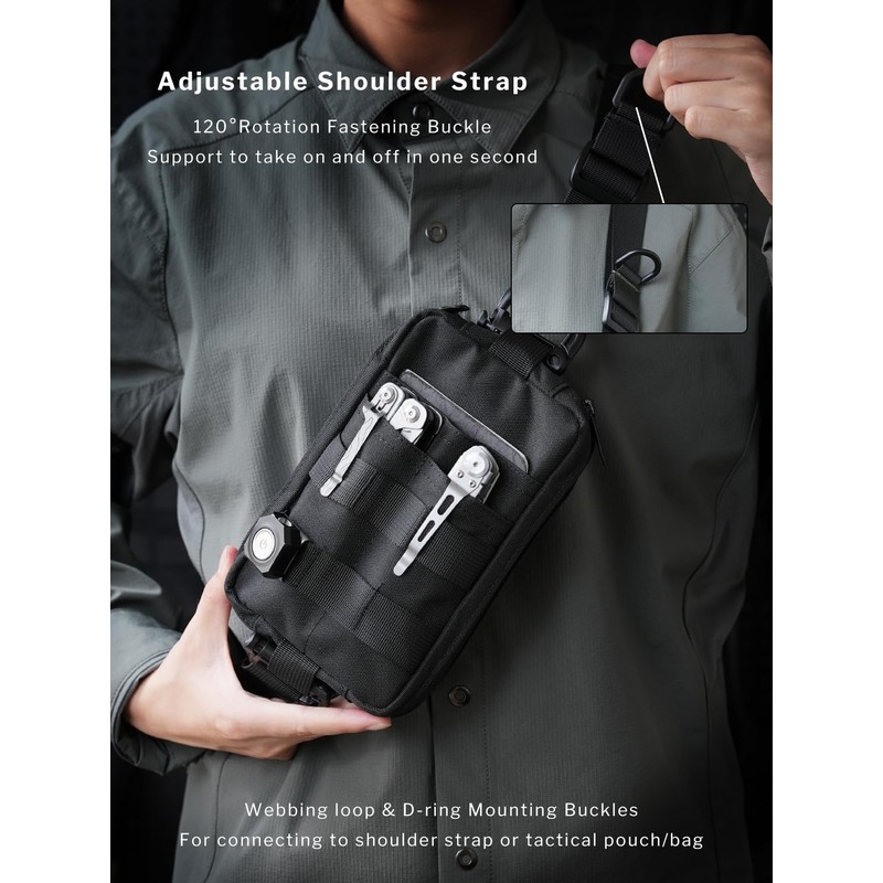 - 【Adjustable and Removeable Shoulder Strap】The strap of this molle tactical tool pouch can be adjusted and removed which suits your different needs. The dimension of this strap is minimum 73cm/28.74in to maximum 120cm/47.24in. When removed the shoulder strap, through top webbing loop while using a buckle, attach this edc pouch to your belt, molle backpack or molle vest as a waist pouch or additional bag.