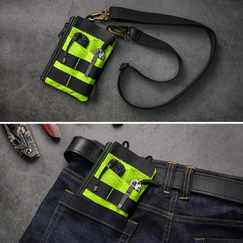 - All in one, you can carry this EDC pocket pouch every day. 3 EDC slots for small folding knives, tactical pens, pry bars, etc. Front large pocket for your cell phone with thin case or notebook, and the back pocket can hold your multitool or folding knife. 2 zippered pockets can hold your cards, change, cash, etc.
