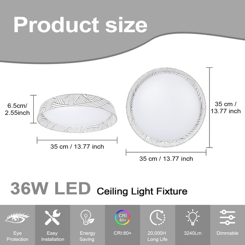 - Wide Range of Applications: The chassis diameter is 11.8”, and with the outer cover, it is 13.77”. 36W light easy to install ceiling light is ideal for kitchen, balcony, bedroom, study room, dinning room, small living room, utility room, small office, hallway, etc. Our ceiling light suitables for 10-15m², you can choose carefully according to the application