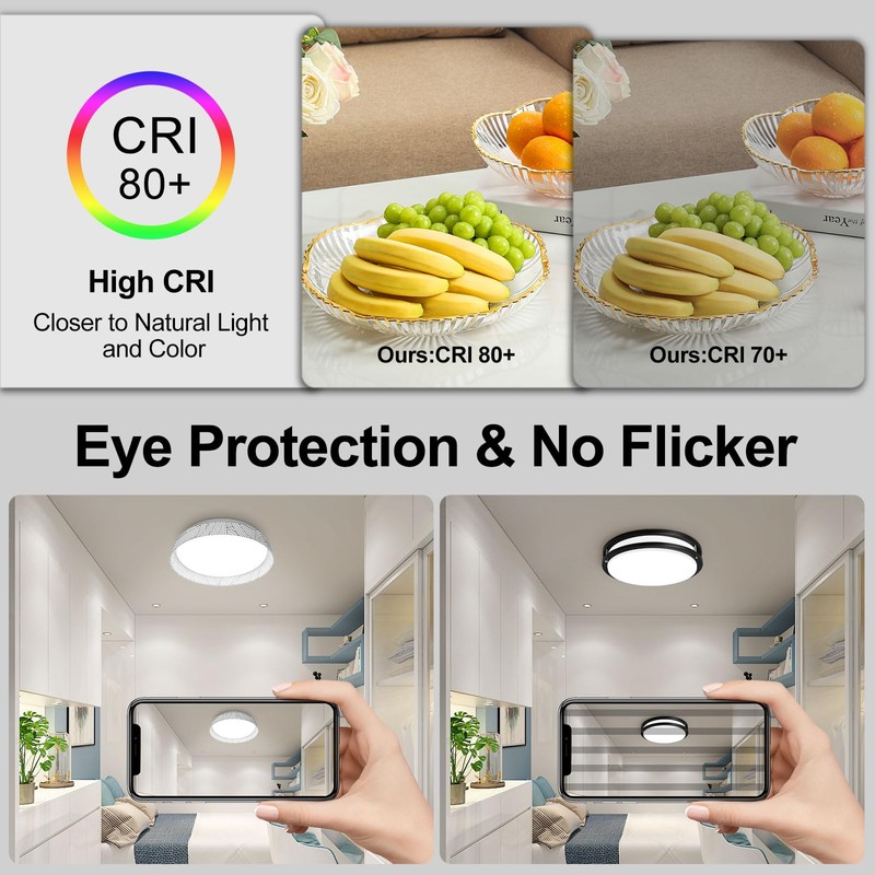 - Eye-Comfort Lighting & High CRI: Featuring an advanced PC optical diffusion panel, our silver-edged flush mount ceiling light delivers uniform, glare-free illumination with high light transmission. Engineered to eliminate 100% flicker and filter harmful blue light, it provides fatigue-free lighting ideal for study rooms, nurseries. High color rendering index (CRI=80+) ensures natural, soft warm light that enhance true color accuracy