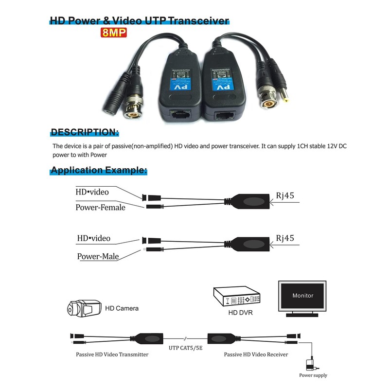 - VIDEO TRANSCEIVER: This powered video transceiver is a passive (unamplified) device that enables real-time monochrome or color video transmission over unshielded twisted pair (UTP) telephone cable. Power and video are routed through UTP and RJ45 connections.
