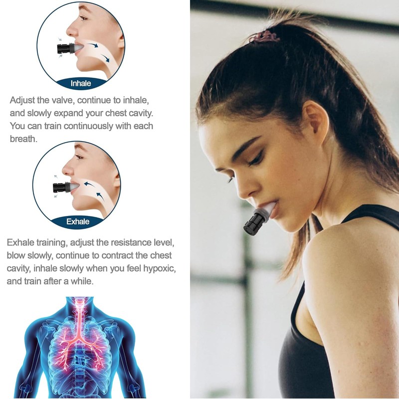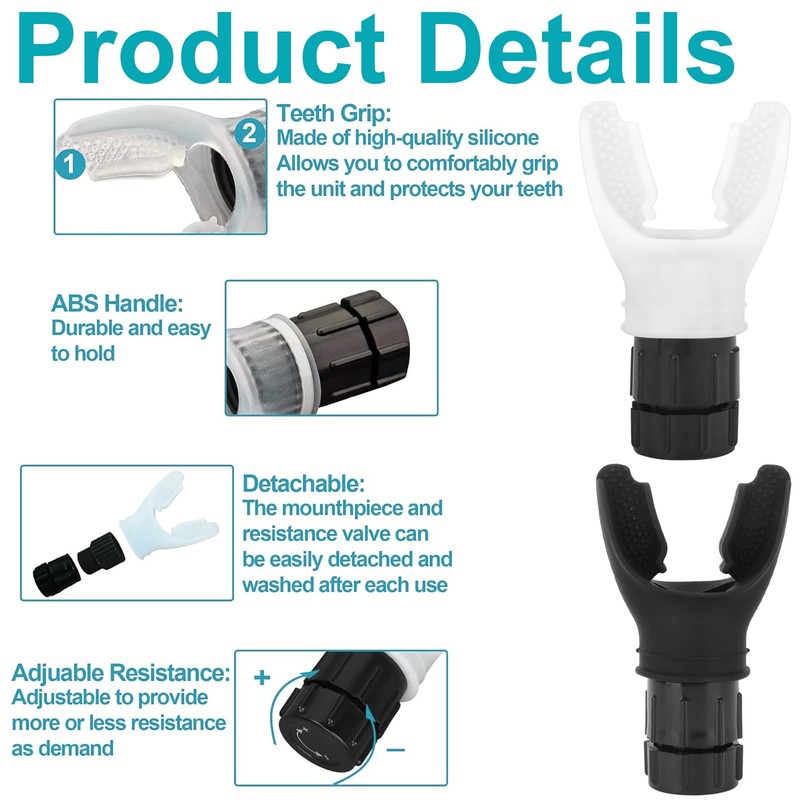 - EXTRA GEAR INCLUDED The breathing trainer comes with an adjustable breathing control valve and two interchangeable silicone mouthpieces that allow for customization and hygienic use.