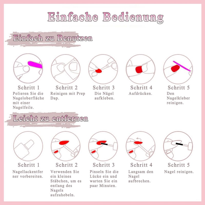 - 【Verfahren zur Verwendung】 Reinigen Sie die Oberfläche der nägel aufkleben und polieren Sie die Nagelform, kleben Sie den Gelkleber auf die fingernägel. Wählen Sie das entsprechende nägel zum aufkleben french aus und drücken Sie es auf Ihre Fingernägel und halten Sie es 5 Sekunden lang fest. Sie können schöne french selbstklebende fingernägel nur wenige einfache Schritt haben. Wenn Sie möchten, dass Ihre french kunstnägel zum aufkleben länger halten, können Sie den Flüssigkleber verwenden - der Effekt hält bis zu 1 Woche an.