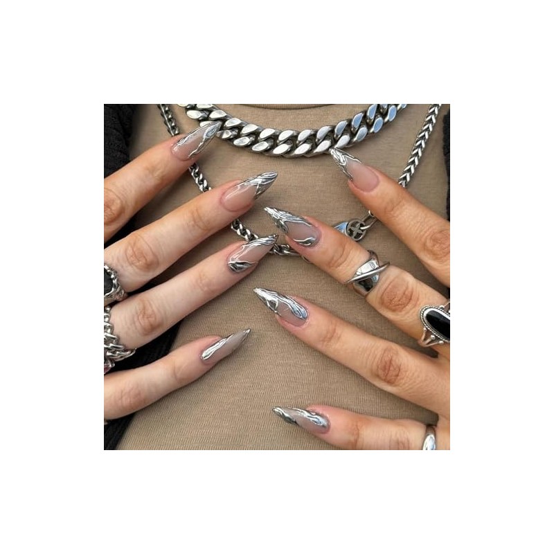 Virellay Pack of 24 False Nails for Sticking on (Almond Silver Liner, 24 Pieces)
