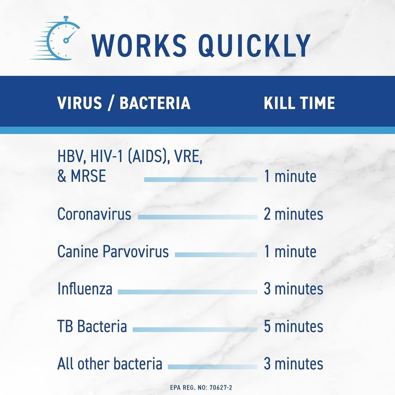 - It kills a broad spectrum of microorganisms, including HBV, HIV-1, VRE, MRSA, GRSA, MRSE, VISA, PRSP, Herpes Simplex Types 1 & 2, Influenza Type A2, Adenovirus, Rotavirus. Kills HBV and HIV-1 in one minute. Kills Tb in five minutes and all other bacterial in three minutes. Kills Norovirus in 30 seconds. EPA Registered 70627-2