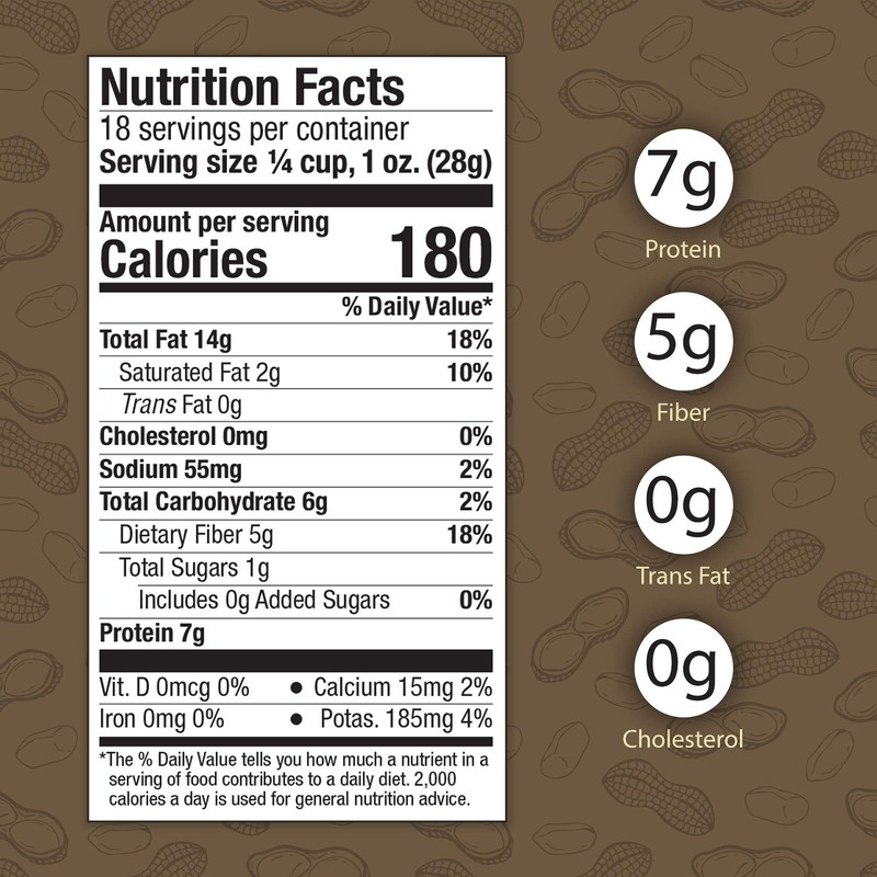 • ALL NATURAL - No Preservatives, No Cholesterol, No Trans Fats, Heart Healthy. Peanuts provide about 7 grams of powerful plant-based protein per serving and good sources of fiber, vitamins, and minerals.