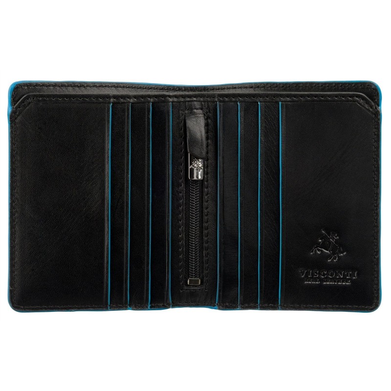 - 6 card slots, 2 slip pockets for extra cards etc, single banknote section and central zipped pocket. Embedded Visconti branding fitting, branded fabric lining and presentation box.