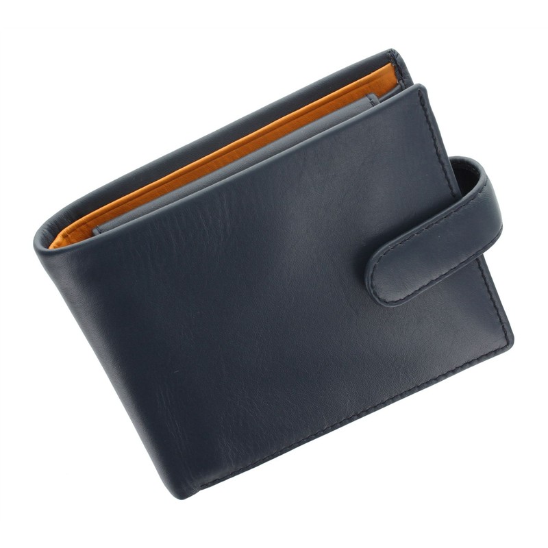 - 2 sections for banknotes. Coin section with press stud fastening. The wallet is secured by a leather tab with a press stud fastening.