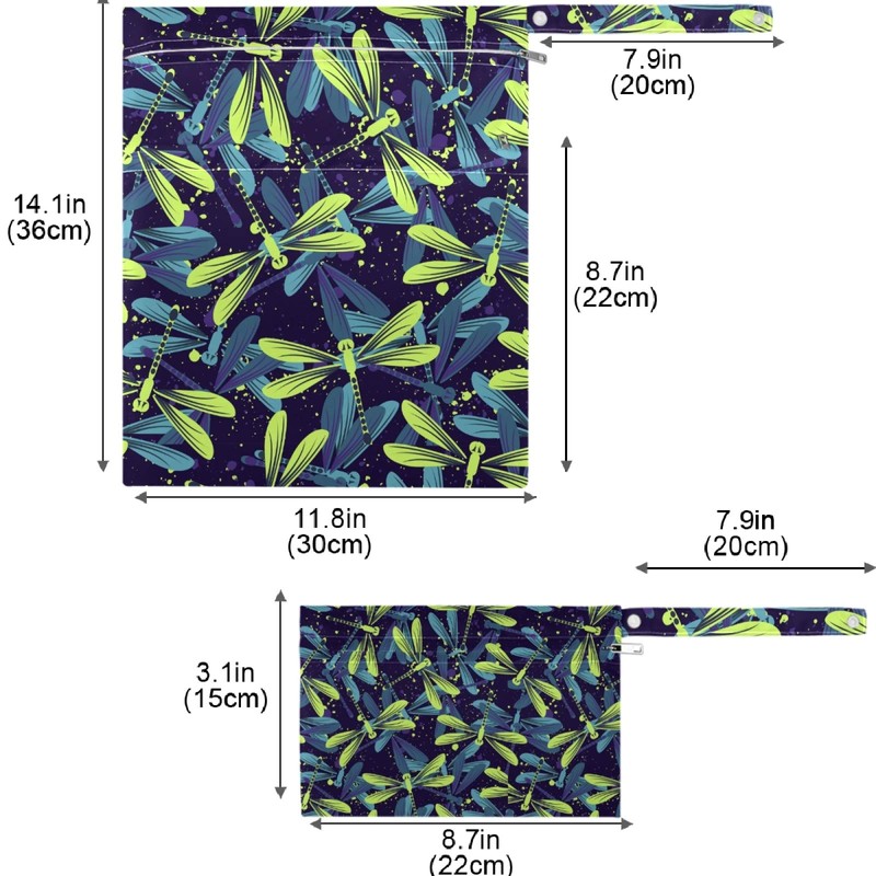 visesunny Blue Yellow Dragonfly Dot 2Pcs Wet Bag with Zippered Pockets Washable Reusable Roomy for Travel,Beach,Pool,Daycare,Stroller,Diapers,Dirty Gym Clothes, Wet Swimsuits, Toiletries