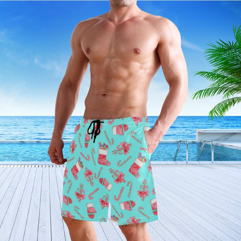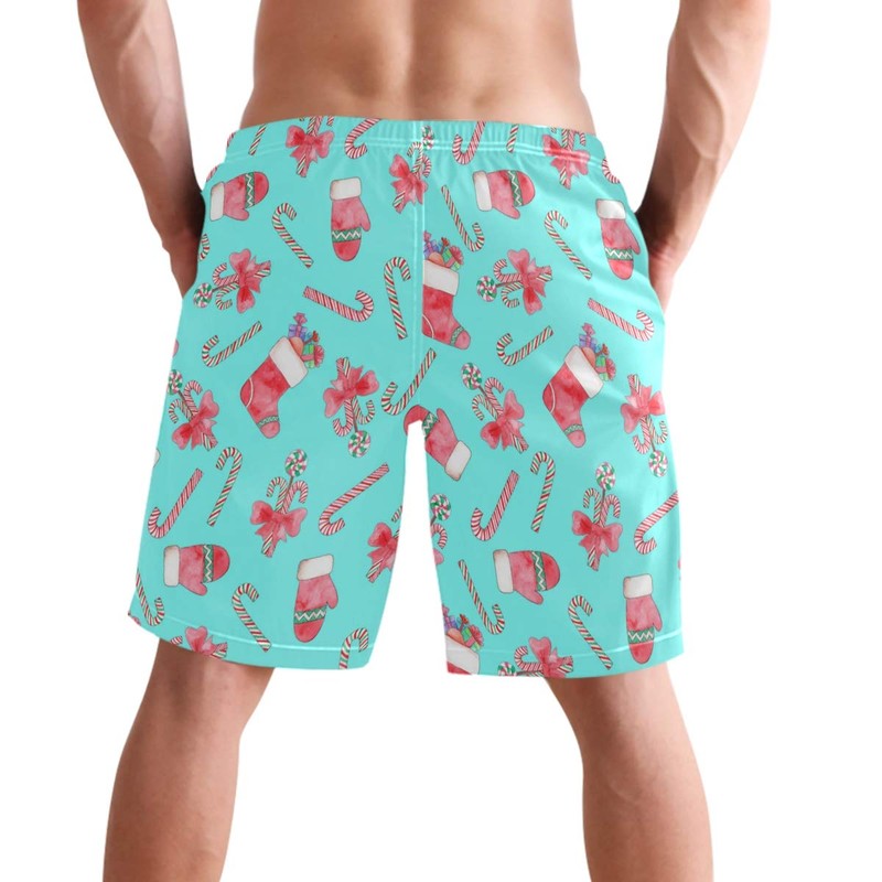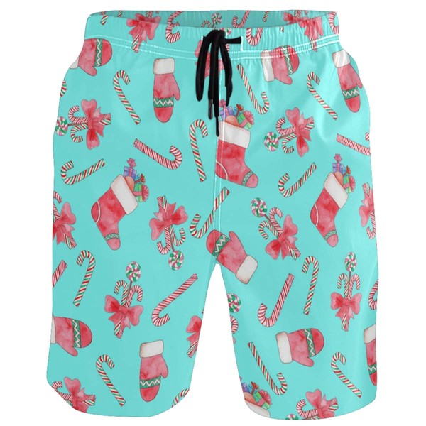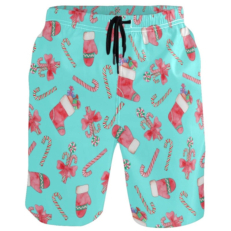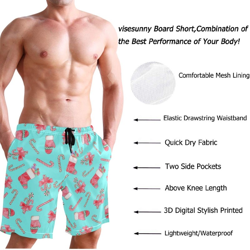 visesunny Christmas Candy Cane Stockings Print Men's Beach Short Swim Trunks Sports Running Bathing Suits with Mesh Lining