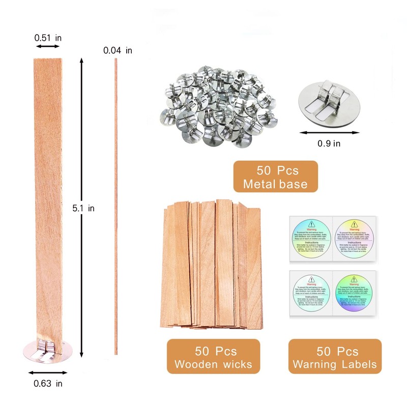 - What you can get: The package includes 50 packs of wood candle wicks with metal base, 50 pcs candle wick stickers, 50 pcs candle wicks warning labels. Exactly what you need if you want to have a try at DIY your candles with wooden wicks.