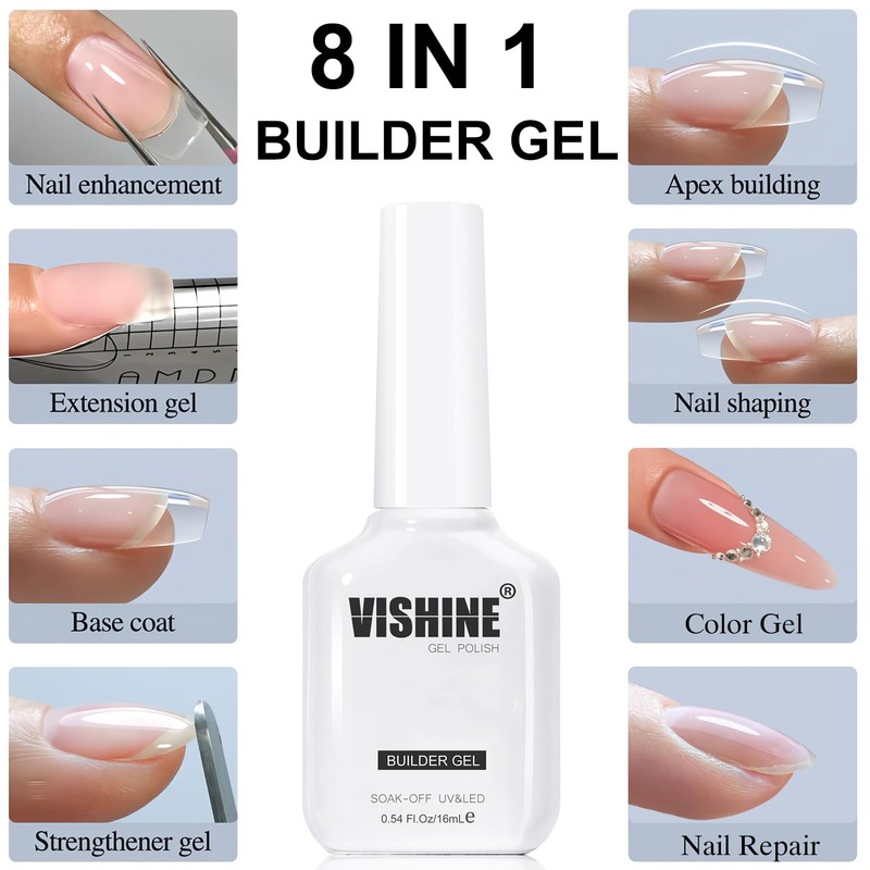 - Exclusive 8-in-one builder nail gel: designed with innovative formula, this versatile clear gel builder is ideal for 8 amazing applications including thickening overlay, building apex, extending length, shaping nail, to attach false nail tips/gems/jewels and as a base gel. Note: need to be cured under U V / LED lamp for 60-90s