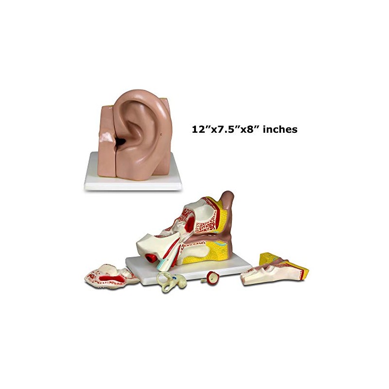 Ear - This four-part plastic model is enlarged approximately four times. The detachable petrous portion of the temporal bone reveals the middle and inner ear chambers, for a closer view. Removable tympanic membrane with malleus, incus, and stapes. The external ear is represented by the auricle and auditory canal.