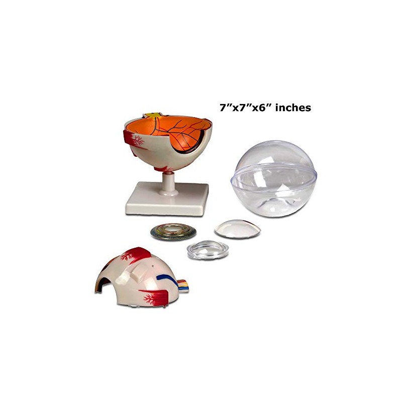 Eye - This six-part plastic model is enlarged approximately four times, displays muscles, blood vessels, optical nerve and other major features of the human eye. Eyeball is dissected horizontally to reveal retina, choroid and sclerotic. The iris and cornea unit is detachable. Convex lens magnifies and forms inverted images.