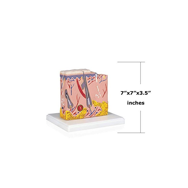 Human Skin Model from Scalp Section - This plastic model is enlarged 50X from a human scalp section. This relief model displays contrasting colors of the three skin layers–epidermis, derm, subcutis, nerves, sweat glands, hair roots, and vessels. Labeled diagram included.