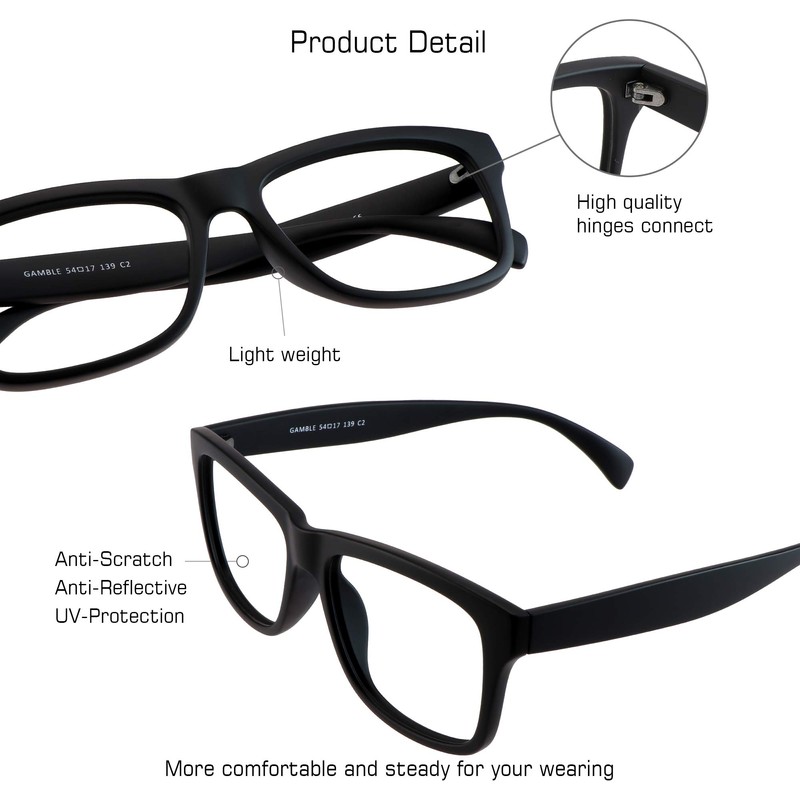 - Material:11g, ultra lightweight, frame TR90, no pressure on ears for long time wearing. Lens Resin. Square shaped frames with a black pattern, crafted from lightweight yet durable TR90